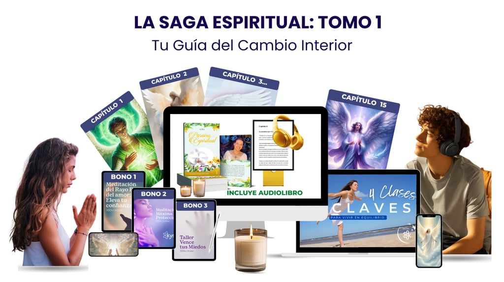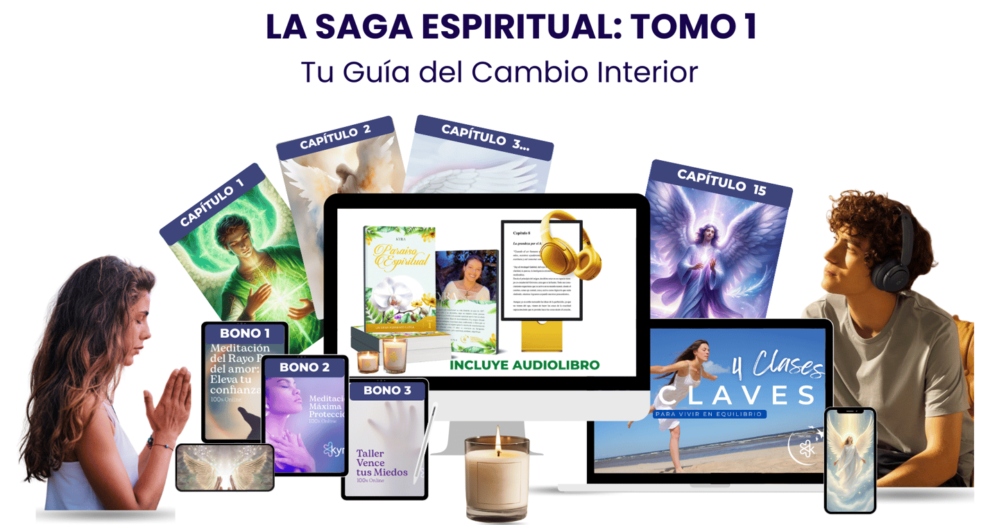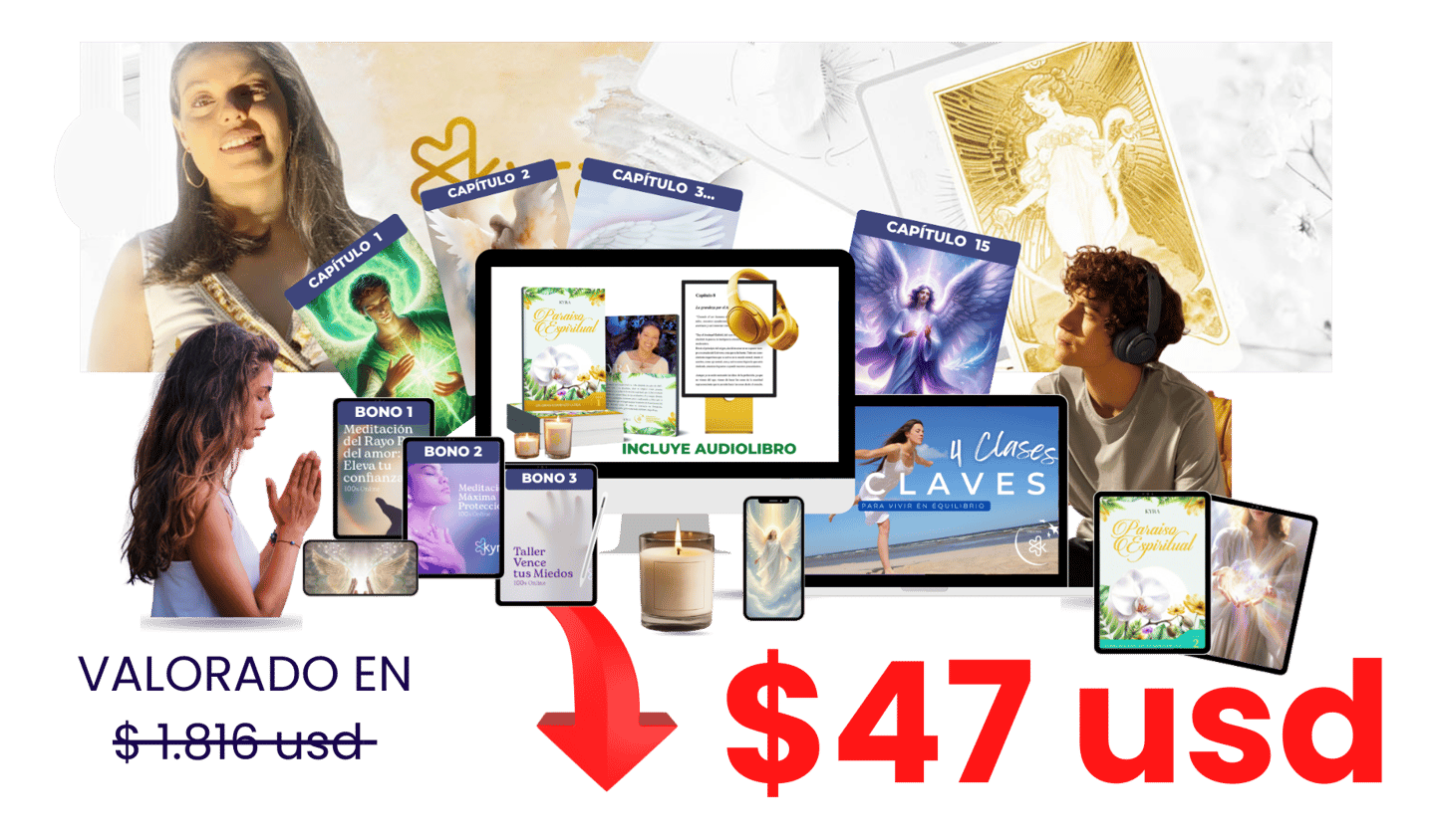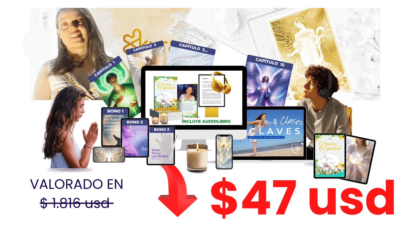 Tiene 15 capítulos y más de 40 prácticas espirituales para tu evolución. Incluye audiolibro en español con la voz de Kyra para lograr conectarse en meditaciones sin estar leyendo + los bonos que te ayudarán a crecer más rápido espiritualmente soltando las cargas que pesan. es lo que necesitas para comenzar a liberarte y empezar a construir una vida nueva.